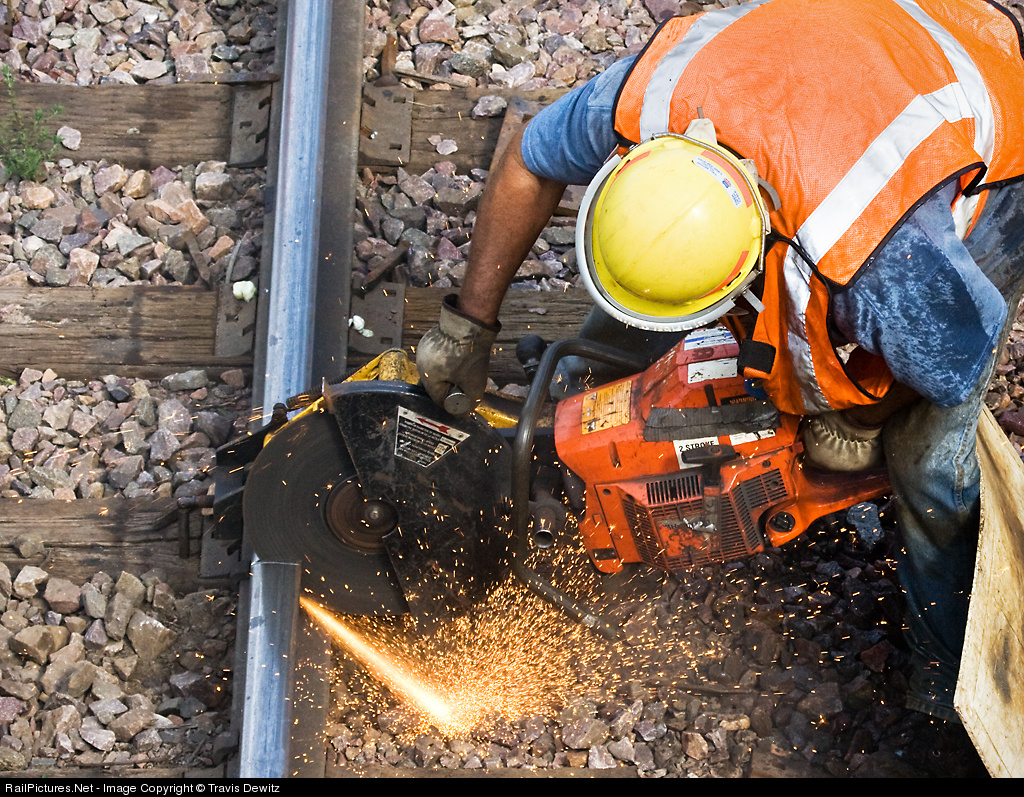 A Union Pacific MOW worker cuts a piece of stick rail just outside the Altoona yard so that the new welded rail can be spliced in for the night before work resumes again the next day.