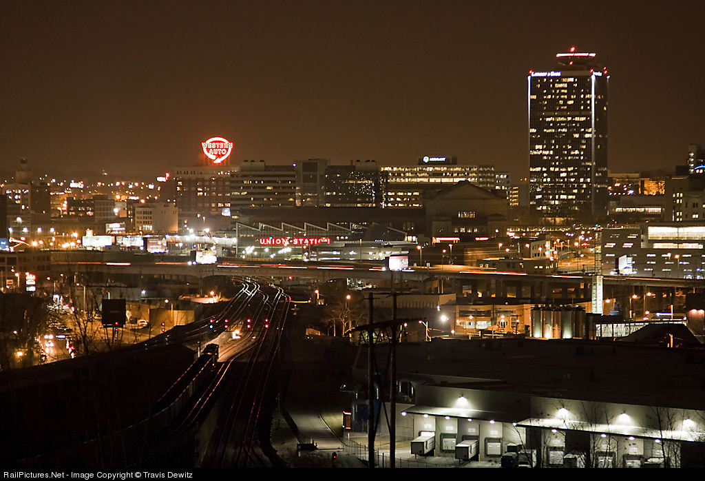 A coal train can be seen lighting a path through the heart of Kansas City.