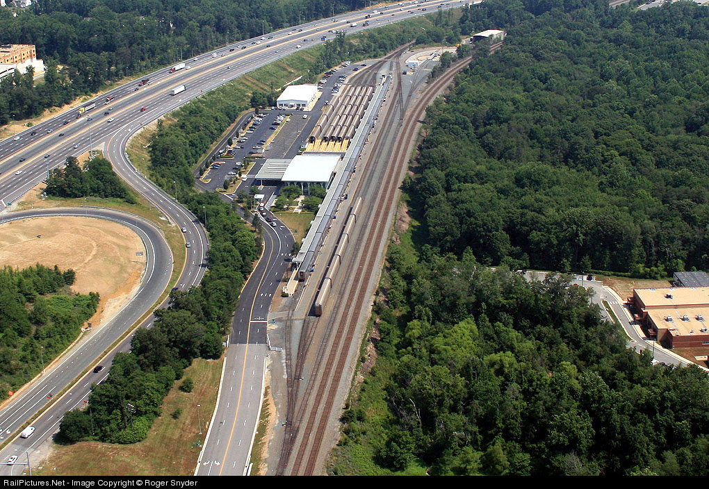 It's 11am on June 8 and Amtrak P052, the "Auto Train", has discharged all its passengers and automobiles after its overnight run from Sanford, FL to the Lorton, VA terminal. By 4pm, the consist will have been cleaned and reloaded for the daily trip south as P053. Note the turntable at the upper end of the yard. It is relatively new, replacing a wye track that was removed due to the widening of adjacent I-95.