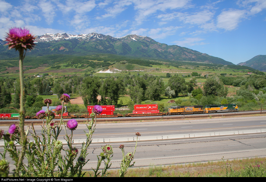 Sandwiched between the still snowy Wahsatch Mountains and some blooming thistles, this 2 by 2 110 car stack train led by the CNW heritage engine looks right at home.