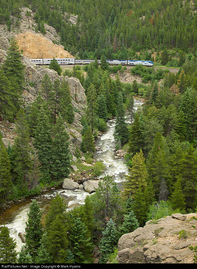 A late westbound California Zephyr begins the 12-degree horseshoe curve just east of Pinecliff. This curve is the sharpest east of the Moffat Tunnel, and takes the train through the shortest of the Tunnel District tunnels: Tunnel 29, which is virtually below my feet.