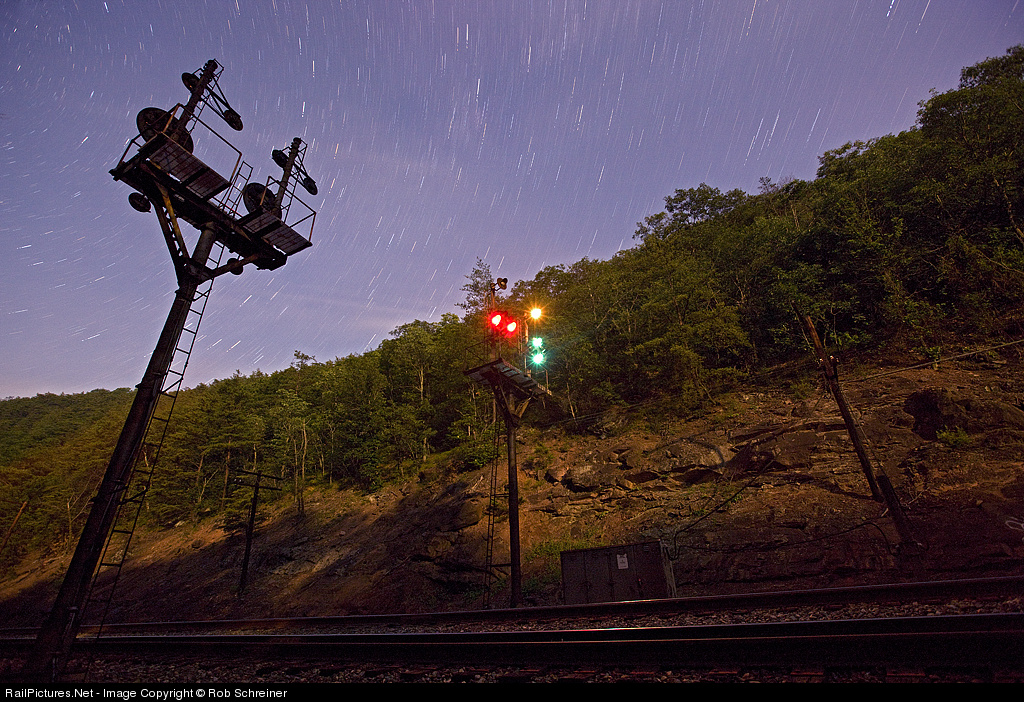 Almost midnight in the mountains and an eastbound Q train is on the approach. On the Cumberland Sub, this is the last pair of bracket masts still standing between Paw Paw and Hancock. Change has come, and in my opinion, its not good.