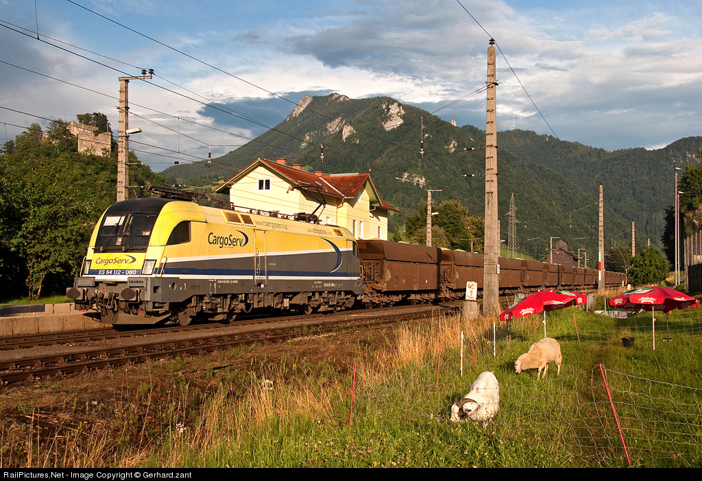 | ES 64 U2 080 with CargoServ, from Eisenerz towards Linz steelworks after a heavy rain shower this evening. |