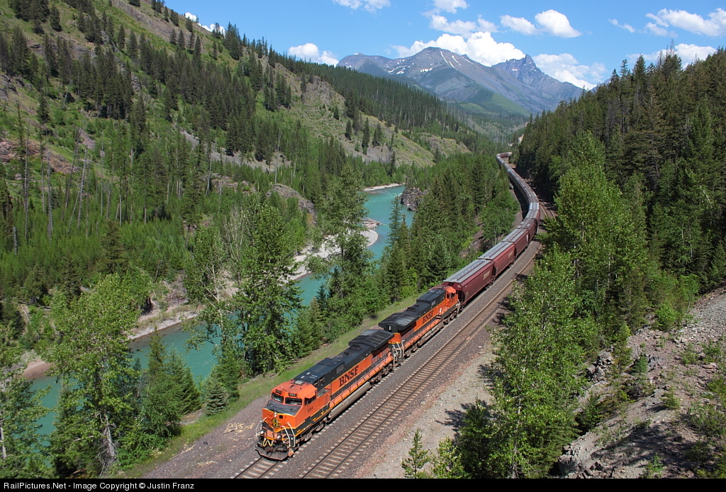 Just Like The Posters: When Great Northern Railway promoters tried to sell the wilds of Montana to potential travelers, this is what they were thinking of; tall mountains, rapid rivers, stunning scenery. A BNSF grain train wraps through one of those poster like scenes on the afternoon of July 17, 2011.