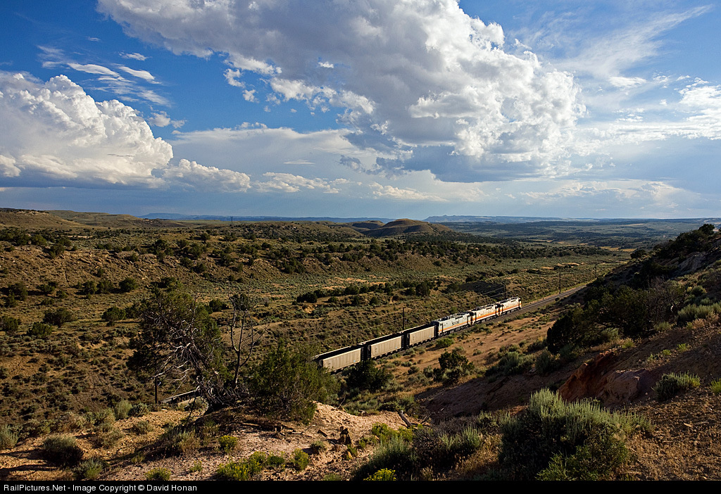 The northwest corner of Colorado is easily characterized as rugged; it's a tough place for anything to survive, and as the scrub brush adorning the rocky ridges attests, precipitation is a scarce commodity. However, it is in this tough land that the Deseret Power Railway not only survives, but even thrives -- some eight to ten loaded coal trains roll across this lumpy landscape each week, fueling the hungry fires of a power plant eager to supply electricity to its distant customers. A line of thunderstorms looms above the horizon as the swing shift's loaded train drops down the back side of Holum Pass, still a good 30 miles and an hour of hard running from its destination near Bonanza. Photo from railroad property taken with permission.