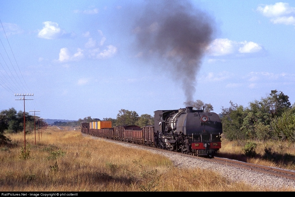 Steam hauled containers! 731 is a 4-8-2+2-8-4 20th class Garratt loco, looking far to big to run on 3 feet 6 inch gauge track. It is seen just a few miles from Victoria Falls in 1990.