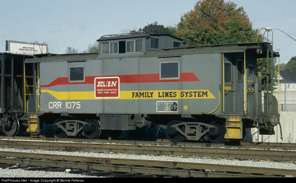 | Clinchfield Railroad caboose #1075 brings up the rear of a Port of Mobile (AL) coal train. Clinchfield Railroad caboose #1075 is one of 10 former Clinchfield red cabooses that were painted into the Family Lines System scheme (11070-11072, 11074-11076, 11079-11081 & 11102) |