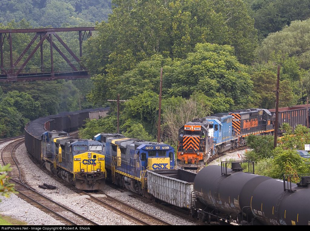 A timely meet? The 2 CSXT trains are actually moving! A well placed gondola allows us to see the WE 3046 on the point of the loaded ore train.