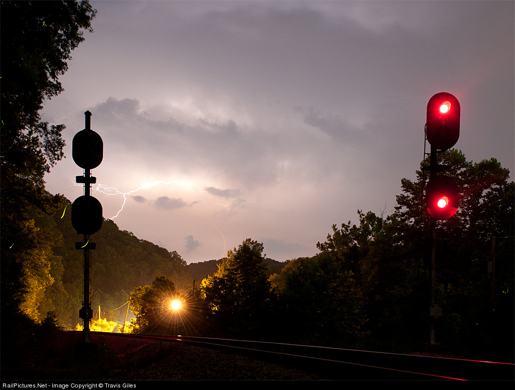 A small storm lights up the sky over the classic C&O signals as a few lightning bugs fly around.