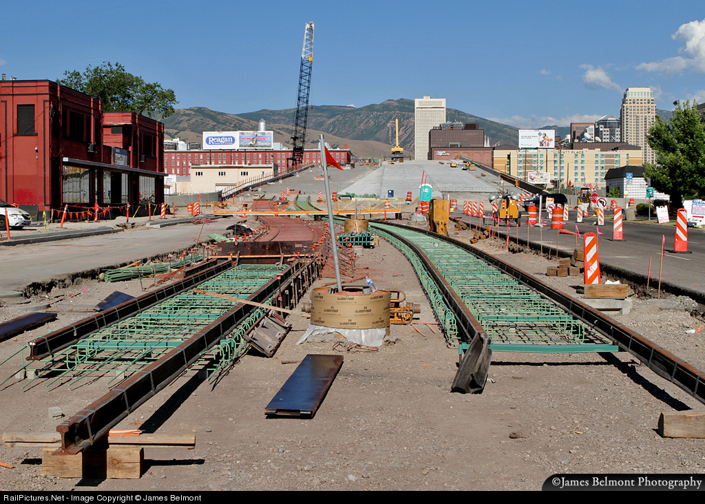 The Utah Transit Authority is currently expanding light rail service in the Salt Lake Valley to the communities of Draper, South Jordan, West Valley City, and the Salt Lake International Airport. Pictured at 6th West, construction crews lay new rail down the middle of North Temple Street for the airport line. The right of way will occupy the north side of the North Temple viaduct crossing both the Union Pacific Lynndyl Sub and UTA's commuter rail line to Ogden. From this point westward, the track will occupy the center of North Temple street to 22nd West where it will move on a private right of way on the north shoulder of Interstate 80. The airport line is scheduled to open for service in 2012.