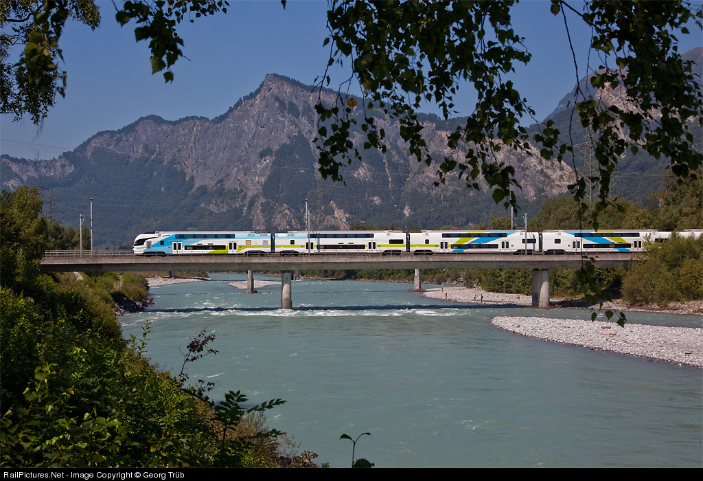 | Brandnew 6 car doubledecker train from StadlerRail for the austrian WESTbahn is crossing the river Rhine between Maienfeld and Bad Ragaz on a test run Landquart - Sargans with speeds up to 160 km p.h. |