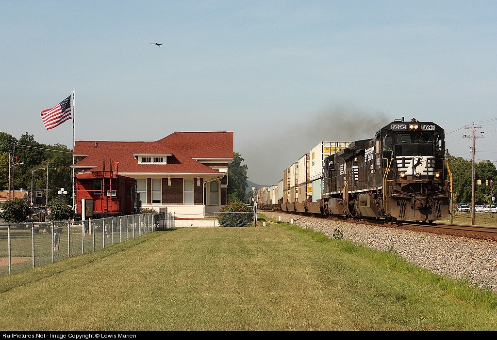Cincinnati, Ohio-Jacksonville, Fla., intermodal NS 229 led by a veteran GE C40-8 races past the restored Southern Railway depot in Spring City, Tennessee on August 2, 2011. 229 has been a hot train on the Cincinnati, New Orleans and Texas Pacific Railway mainline for decades.