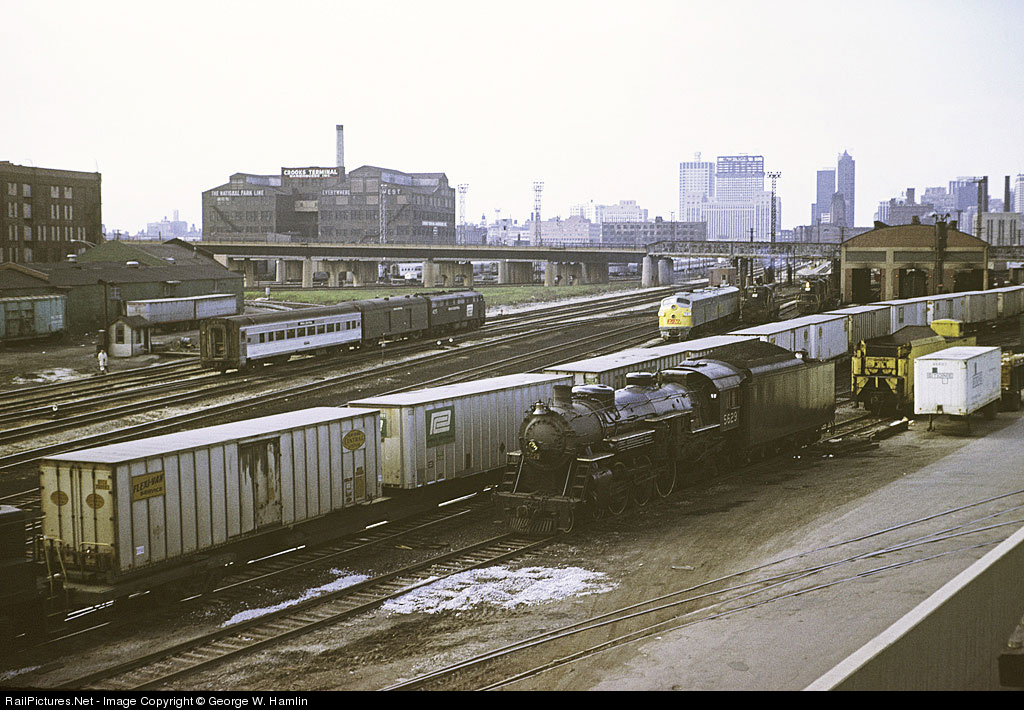 | An eastbound Penn Central mail train passes by Dick Jensen's former GTW Pacific as a Penn Central train from Detroit arrives, two days before Amtrak. Lots to see here, including Flexi-Vans; L&N E units positioned for the start of Amtrak service; the BN (former CB&Q) coach yard in the distance; and even a railfan with camera, near the shed at left. |