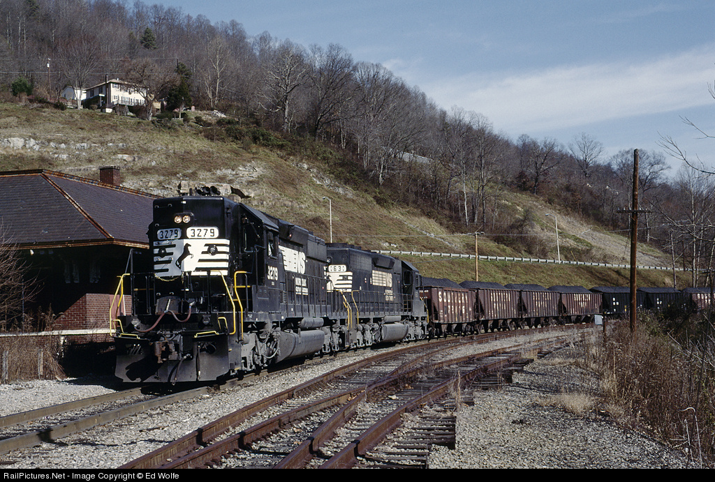 | NS U53 rolls to a stop beside the ex-L&N passenger depot in Appalachia to wait for clearance through Appalachia enroute to Westmoreland Coal's large prep facility in town. U53 returns to Appalachia with 33 "yellow ball" loads gathered from the Roaring Fork loadout on the ex-Interstate Railroad's Roaring Fork Branch. Note that both ex-Southern and ex-N&W hoppers are in "yellow ball" service. |