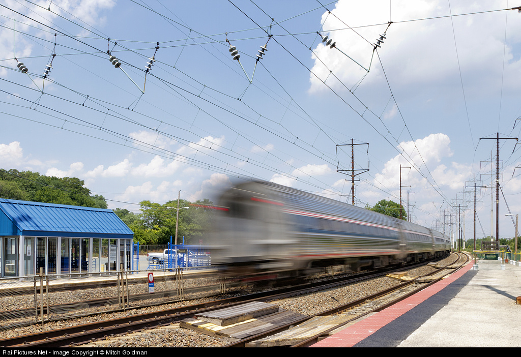 The tail end of an Amtrak Metroliner car whips around the super elevated curve at Claymont, DE en route to Philadelphia, PA. Long gone are the wood ties and jointed rail as seen in Don Oltmann's photo from 1979. At this very same spot, photographer and PS wizard, Bob Lyndall was fortunate to catch both Thomas and Sierra Railway #3, as seen in the respective photos.