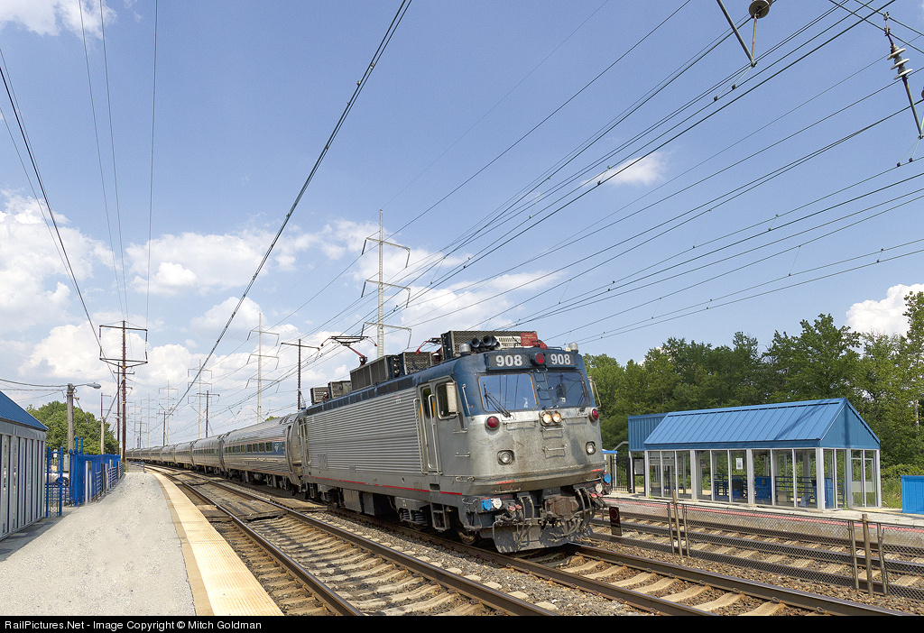 An Amtrak AEM-7 digs in to the super elevated curve at Claymont, DE en route to Wilmington, DE. Long gone are the wood ties, jointed rail and even the classic PRR station as seen in Don Oltmann's 1979 photo.