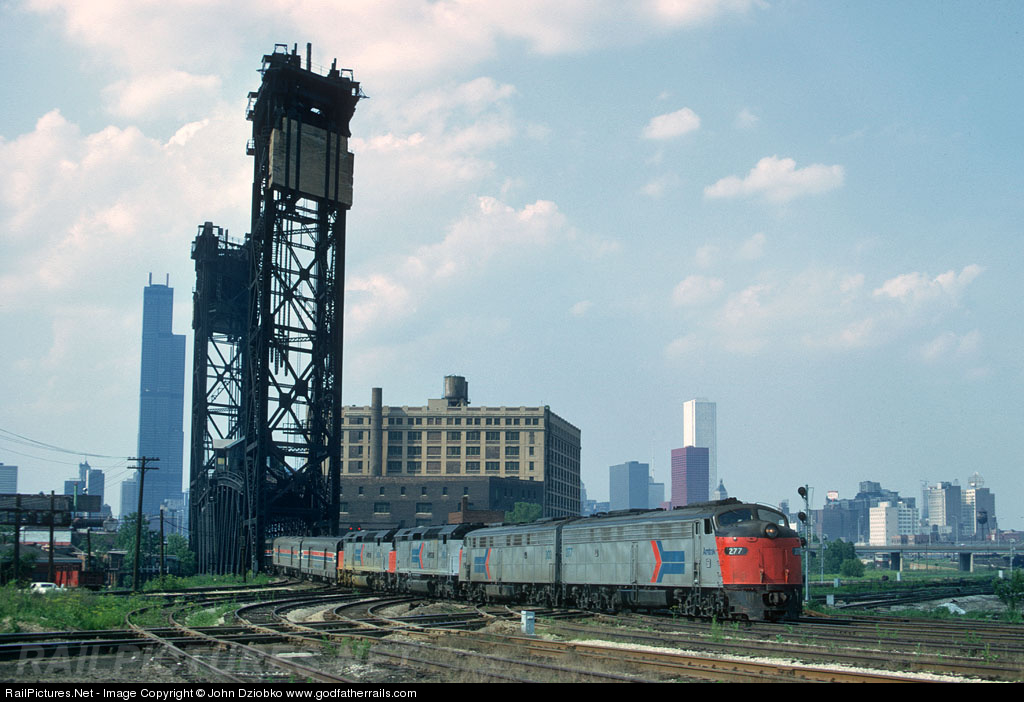 | Early Amtrak heritage; two models of pointless arrow bloody noses take an afternoon train over the many diamonds that still existed at 21st St. during this era. For a glimpse at all the action from that day, click on GodfatherRails.com> |