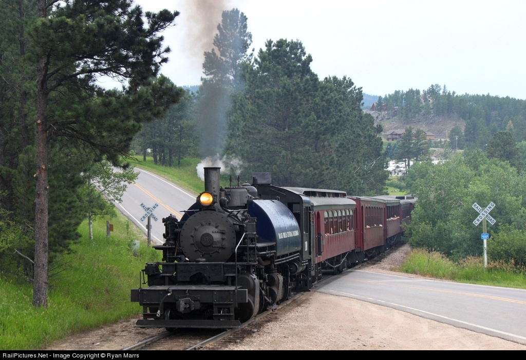 | Weyerhaeuser #110 hauls its 7 car train up the 4-6% grade of Tin Mill Hill. #110 was built by Baldwin in 1928 for Weyerhaeuser's Vail operation where it operated until 1954. At this time it was sold to Rayonier Inc. who used it on their Grays Harbor Line until 1968. Rayonier sold it to the Promontory Chapter of the National Railway Historical Society that year. In 1971 the locomotive was put on display in Heber City, Utah. By 1993 #110 had been sold to the Nevada State Railroad Museum, who put it in storage at their Boulder City site. Finally in 1999 the locomotive was sold to the Black Hills Central Railroad. In January 2001 #110 returned to steam making in the only operating logging mallet in the world. |