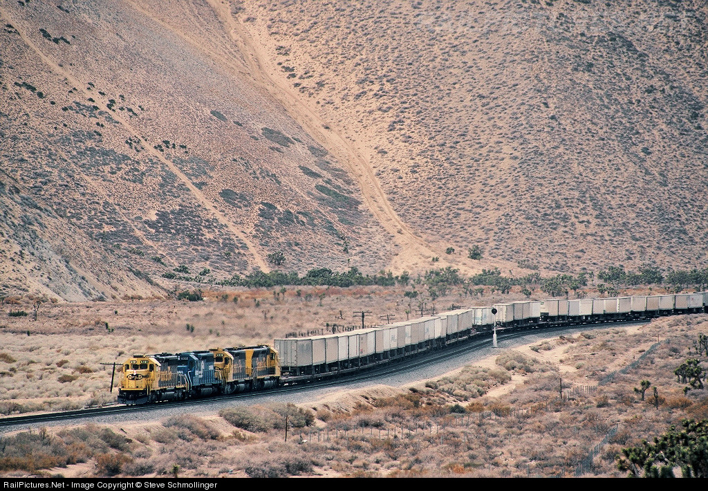 An eastbound Santa Fe pig train drops down through the defile between the Tehachapi Valley at the top of the pass and the Mojave Desert.