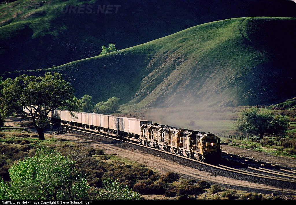 Six EMDs in full throttle roar out of the Caliente Creek Narrows with a long eastbound pig train.