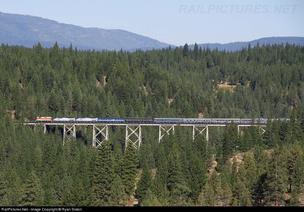 | The quiet still of a beautiful August morning is broken by the equally beautiful sound of a turbo-charged 567 EMD prime mover. WP GP20 #2001 is again on the point of the Feather River express as it makes its way through the scenic feather river canyon on its way west. WP 2001 will be on the train from its home at the WPRM in Portola, CA to Oroville, CA. |