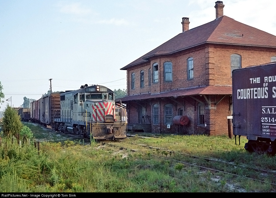 | Northbound NS Aberdeen-Star local passing through Biscoe, NC in September 1972. The depot was the general office of the Aberdeen-Asheboro Rwy. |