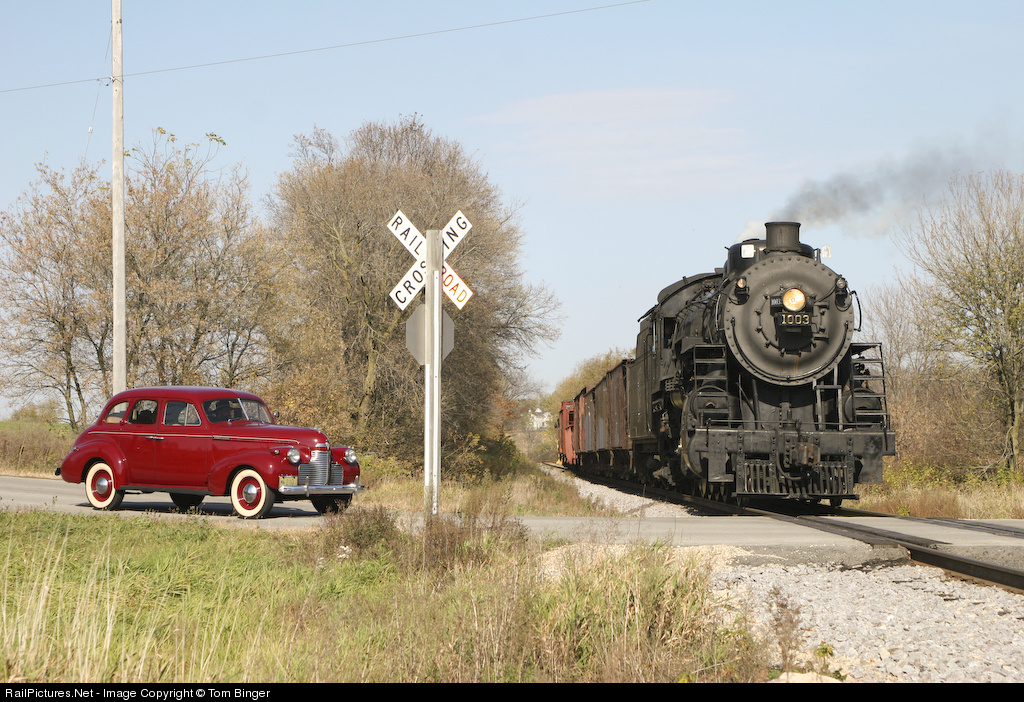 A local freight sponsored by HTP and powered by Soo #1003 passes a local family headed to town in their 1940 Chevrolet.