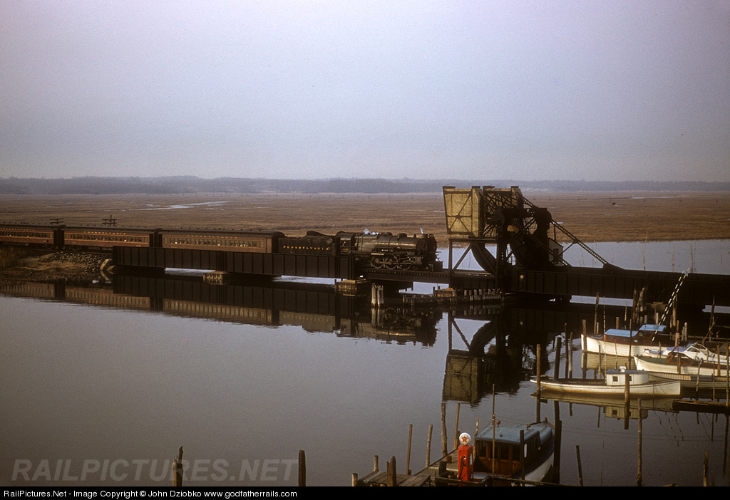 | This train is heading to the Big Apple, crossing Cheesequake Creek. In minutes the steam portion of the trip will end as the K4 is swapped out for the run under the wires into NYC, a decades-long daily practice that will soon be history. Thanks for the ID assistance Andrew and Robert. |