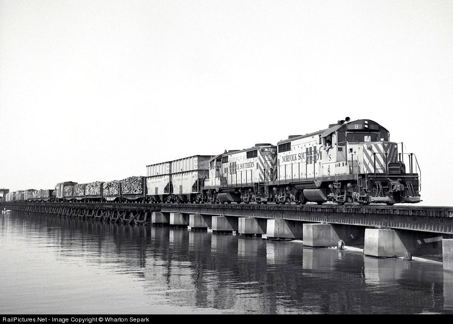 Two Original Norfolk Southern GP18's lead Norfolk bound No. 64 across the Pamlico River bridge at Washington, NC in April 1967. Woodchips and pulpwood are the dominant products in the consist today with two extended-side woodchip hoppers on the headend.