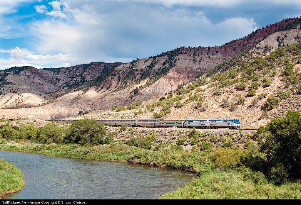 | Running about three hours behind schedule, Amtrak 44 leads a westbound California Zephyr down the Dotsero Cut-Off along the scenic Colorado River. |