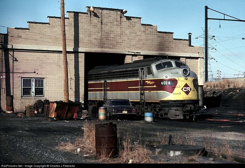 | A former Erie Lackawanna E8, now a part of the Conrail numbering scheme, sits in the engine house at South Amboy awaiting its next call for a run to Bay Head. This was a "bad luck" unit. It was one of the last E8s working the Hoboken to Port Jervis run before being replaced with U34CHs. It had worked the Conrail Cleveland to Youngstown train (until it was dropped). Then it worked the Chicago to Valparaiso Conrail commuter (I think until it was dropped). Then it showed up in South Amboy - luckily having lost its evil mojo. |