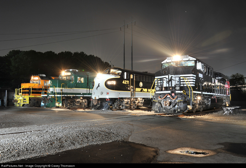 the lineup of locomotives on display at Grand Junction for TVRM's 50th anniversary weekend celebration: NS ES44AC 8088, NS F9A 4271 (along with F7B 4275), NS GP59 4610, Chattooga & Chickamauga GP38 2050, and across the walkway, facing 4610, is NS Operation Lifesaver GP38-3 5826