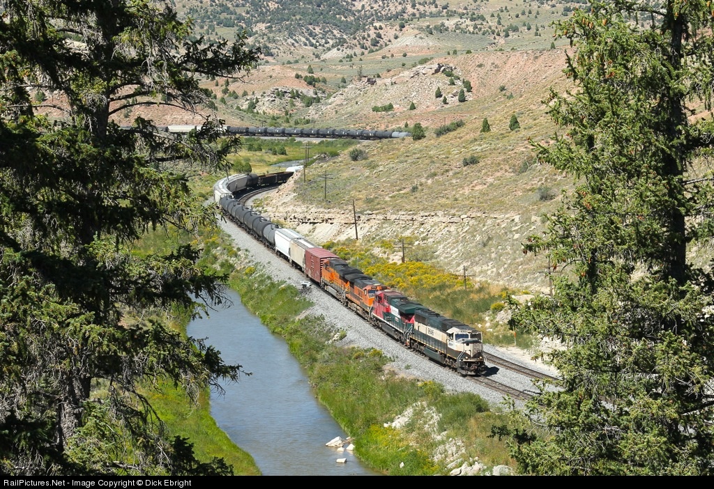 Rare power on today's BNSF trackage rights train. The 9646 is the first SD70MAC leader in my memory, although I have seen a handful of these coal service units as trailing power here in Utah. Here it is hitting the 2.4% downgrade along Utah's Price River at Kyune siding.