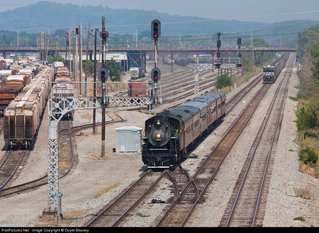 Norfolk Southern's 21st Century Steam excursion passes by DeButts Yard with 630 leading 7 car on the mainline.