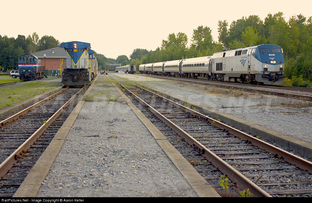 SARATOGA UNION STATION: A FIVE-WAY MEET! Though the sun had dipped below the horizon, I couldn't resist this once-in-a-lifetime view as five trains with power from Alco, GE, and EMD spontaneously arrived at the station at around 6:30 p.m. The meet was totally unrehearsed. Most prominent in the view is the Saratoga & North Creek Railway, which sometimes keeps an Alco S-2 switcher at Saratoga to facilitate runaround moves. The SNC passenger train with lightning-striped GE no. 8524 is getting ready to head back to North Creek with the evening dinner train. Next over and in the extreme distance is a northbound Canadian Pacific/Delaware & Hudson freight en route from Kenwood Yard in Albany to Whitehall and a connection with the Vermont Railway. The train, with an ICE/DM&E EMD SD40-2 in charge, is holding behind the signal for the congestion to clear. Next over are two Amtrak trains — the Ethan Allen and the Adirondack — one traveling down from Montreal, the other traveling to Rutland, Vt. A third late-running Amtrak had just cleared the station on its way south moments before I snapped this incredible photo. Digital photo. Thanks to Railpictures contributor Tim Stockwell for backup assistance.