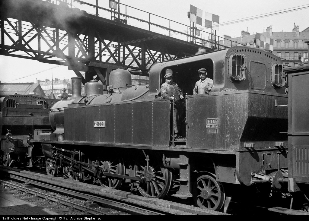 | Here is another Paris suburban tank loco seen at the Gare St.Lazare in Paris around 1926. The ETAT 2-6-2T was working from Versailles depot. Scanned from a glass negative taken by O.J. Morris. |