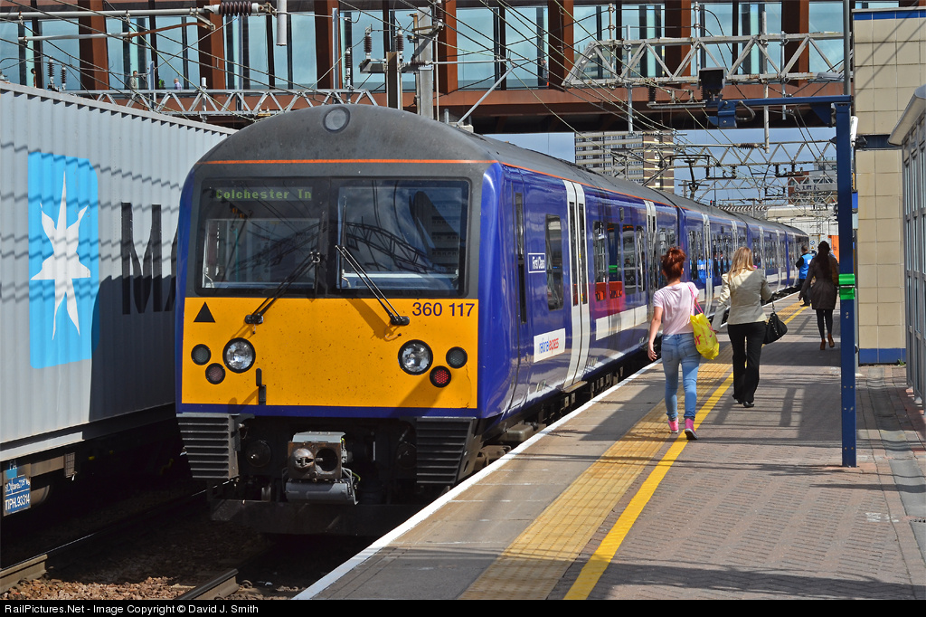 Stratford,in East London is currently undergoing a dramatic change in its stature,being the sight of the 2012 Olympics.As a consequence,the whole area resembles a building sight.Whilst everything around changes,the railway continues in its day to day roll of transporting people in and out of the city.Here,Desiro electric unit 360117 calls at the station with a London Liverpool Street to Colchester service.