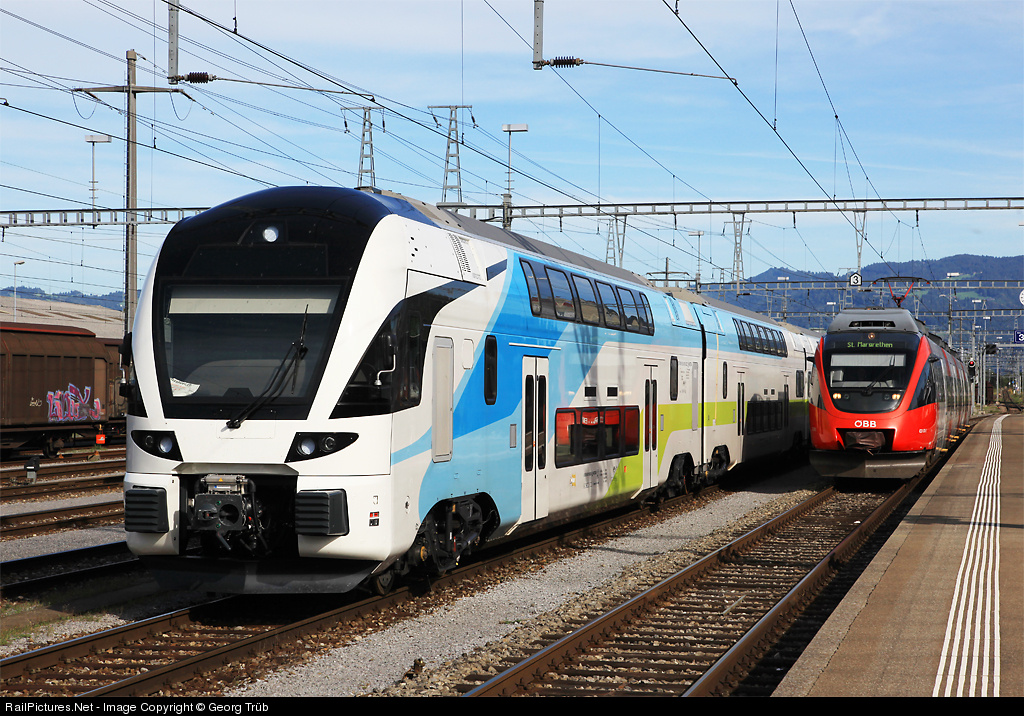 | New double deck trainset ET 4010 002 from Stadler Rail for the Westbahn returned from Austria to Switzerland for further testing in the next days. On the right regional train from Bregenz, ET 4024 003 (Bombardier Talent) of austrian rail OeBB is entering the station. |