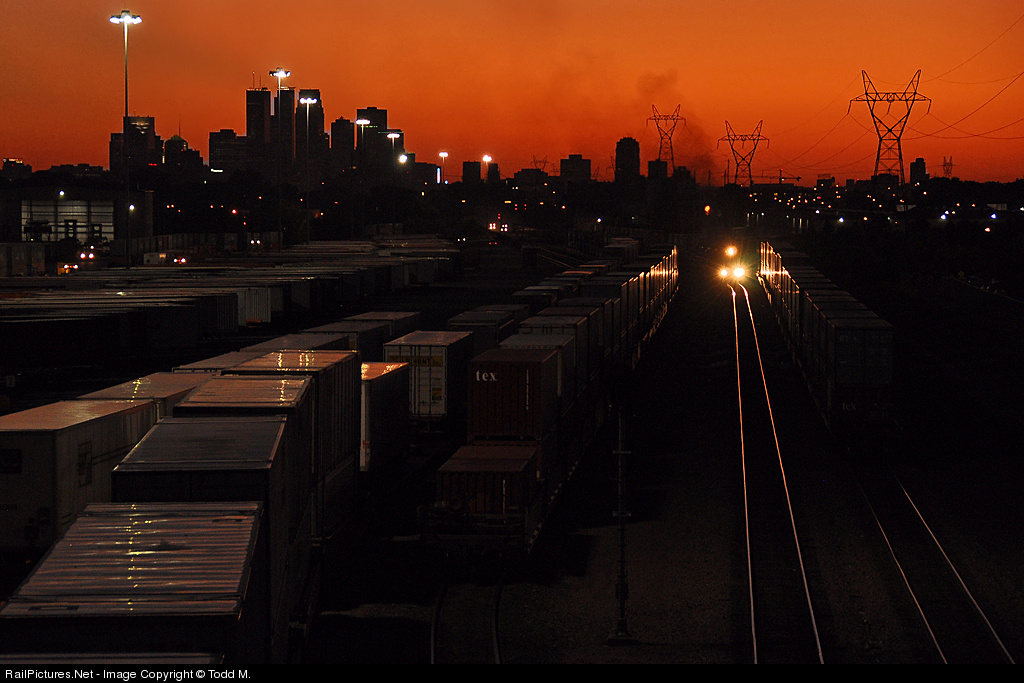| Four old GE's from the Minnesota Commercial Railroad thunder through the BNSF intermodal yard at Midway with a 90 car sand train for interchange with the BNSF in St. Paul where it will in turn head for Texas. That's the downtown Minneapolis skyline in the background. |
