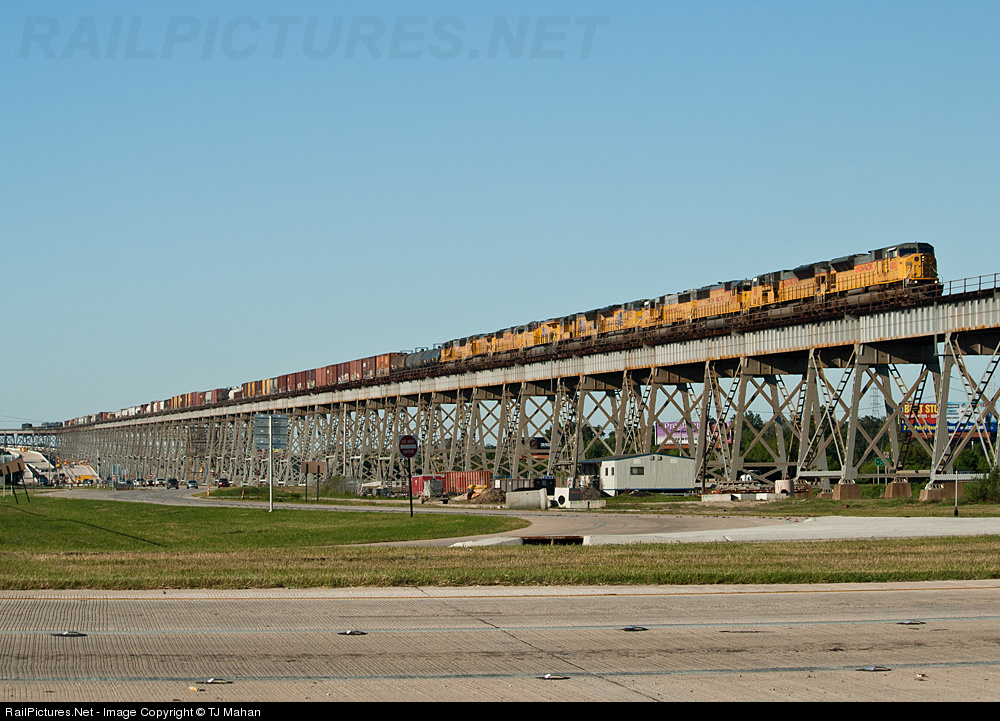 10 locomotives are on the lead of a UP freight descending off the Huey P Long Bridge and almost into the joint UP/BNSF Avondale Yard. The locomotives in this monster consist are UP 8203 (SD9043MAC), UP 8131 (Sd9043MAC), UP 2198 (SD60), UP 2384 (SD60M), UP 8667 (SD70ACE), UP 3947 (SD70M), UP 7477 (ES44AC), UP 4369 (SD70M), UP 9525 (C41-8W), UP 2432 (SD60M).