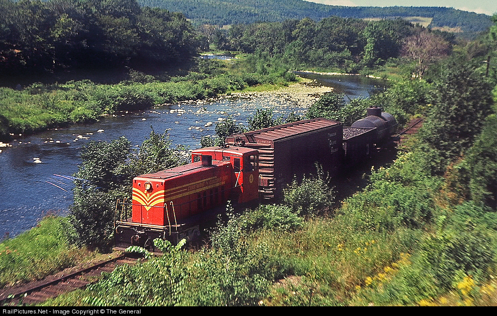 | Claremont and Concord GE 70 Tonner #9 ambles along the Sugar River eastward out of Claremont to serve Newport, New Hampshire and end of the line to Concord. The empty AMOX tank, picked up a few miles back is only along for the ride. |