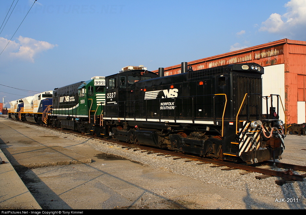 NS SW1500 2227, NS BP4 999, FMG Corp SD9043MAC 905, and FMG Corp. SD9043MAC 909, sit along side Chestnut Ave. on the display track as they call it, at the Juniata Shops in Altoona,Pa. The two FMG's are former UP SD90MAC-H Phase 2's, that have recently been rebuilt to a 9043MAC designation for FMG of Australia.
