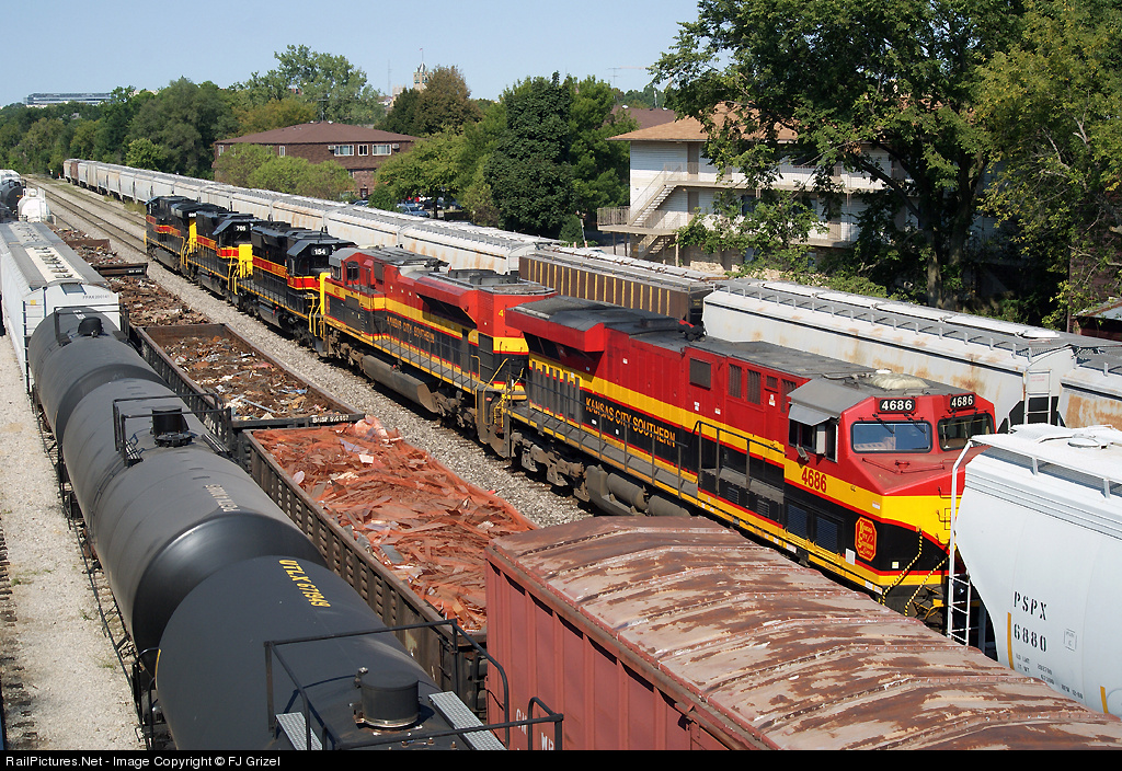 A trio of Iowa Interstate engines leads a KCS detour through the IAIS Yard in Iowa City.