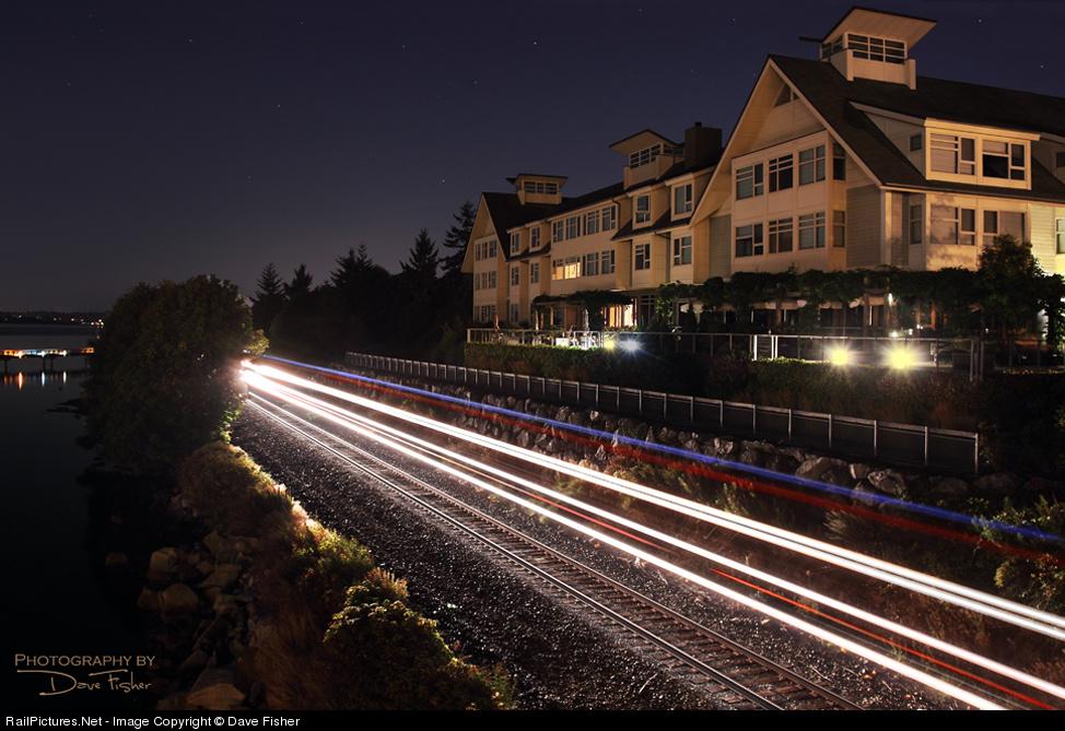 | 2AM on a moon lit morning a BNSF freight train heading south bound pulling empty hopper cars passes within a few feet of the The Chrysalis Inn in Fairhaven Wa. Your first hint that there's trains is a small sign at the check in counter that reads "Occasional Brief train noise", the second was the earplugs on the bedside table.