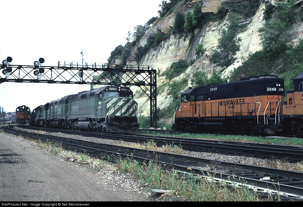 | Two F45s, a U25C, and an SD45 lead a BN freight into Pig's Eye yard in the midst of Milwaukee Road activity. |