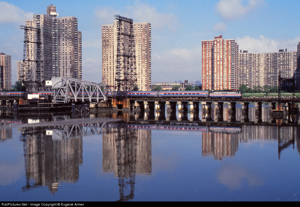 | Amtrak's train 198 "The Benjamin Franklin" is dwarfed by the drawbridge towers and the surrounding apartment buildings, as it crosses the Pelham Bay, eastbound to Boston behind an AEM-7. |