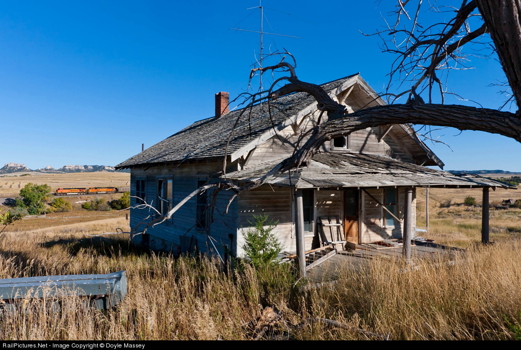 An empty coal train returns for another load passing an abandoned house on the outskirts of Crawford.