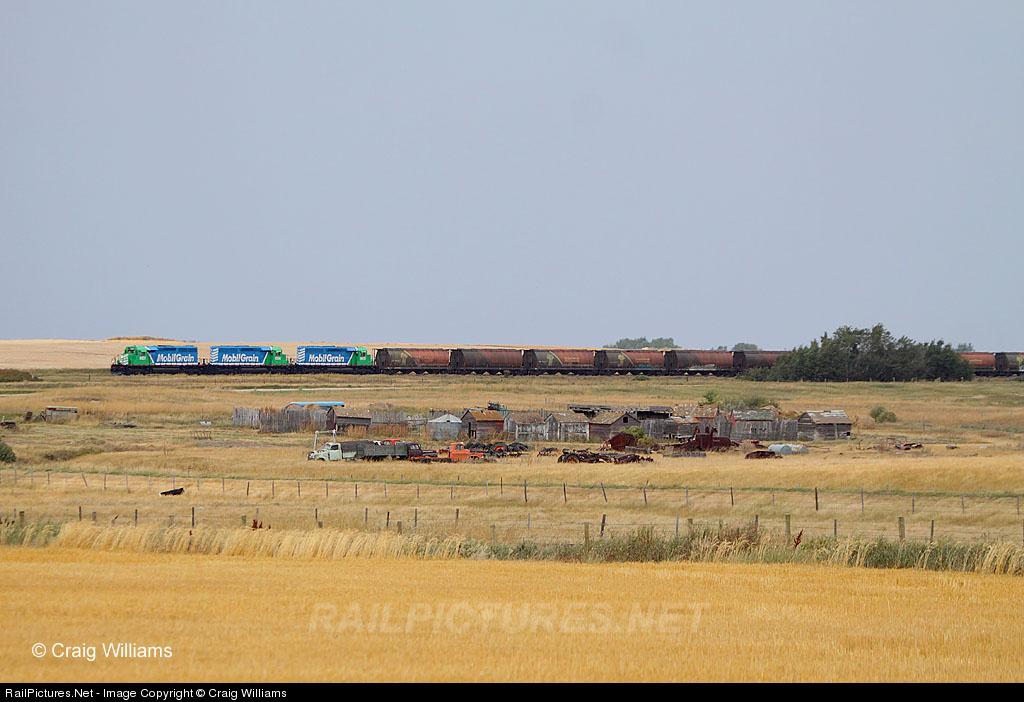 | A Mobil Grain train rolls south on the Last Mountain Railroad side of things towards Bethune. This train has grain off the Lucky Lake Line bound for Bethune for cleaning and reloaded as cleaner grain. This railroad has 7 SD40's to help with the expanding operations, here 3 ex-Alstrom SD40's pulls 39 loads into Aylesbury. |