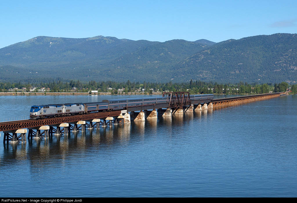 With a delay of more than nine hours, Amtrak's Empire Builder runs over the bridge towards Pasco. Final destinations of this train are Portland and Seattle