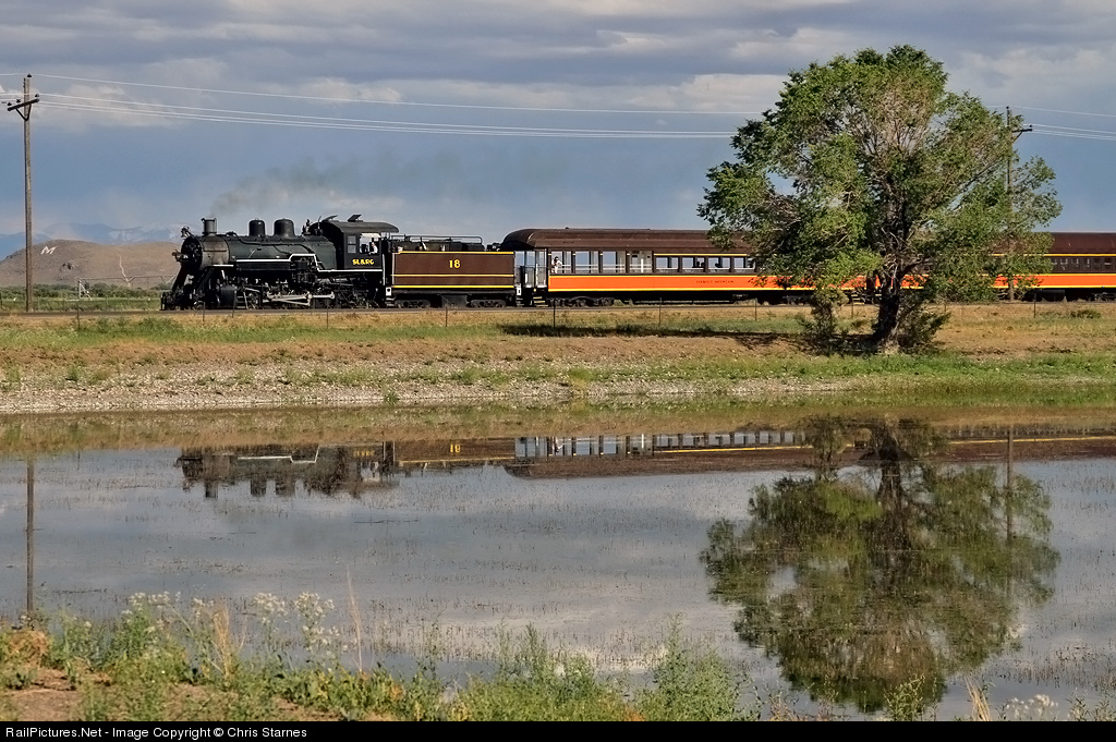 | Northbound Antonito-Alamosa passenger train lead by SLRG #18 rolling through the rural southern Colorado landscape on a beautiful summer evening. The train has been to Antonito to make a connection with the Cumbres & Toltec Scenic and is seen here making its northbound trek back to Alamosa. |